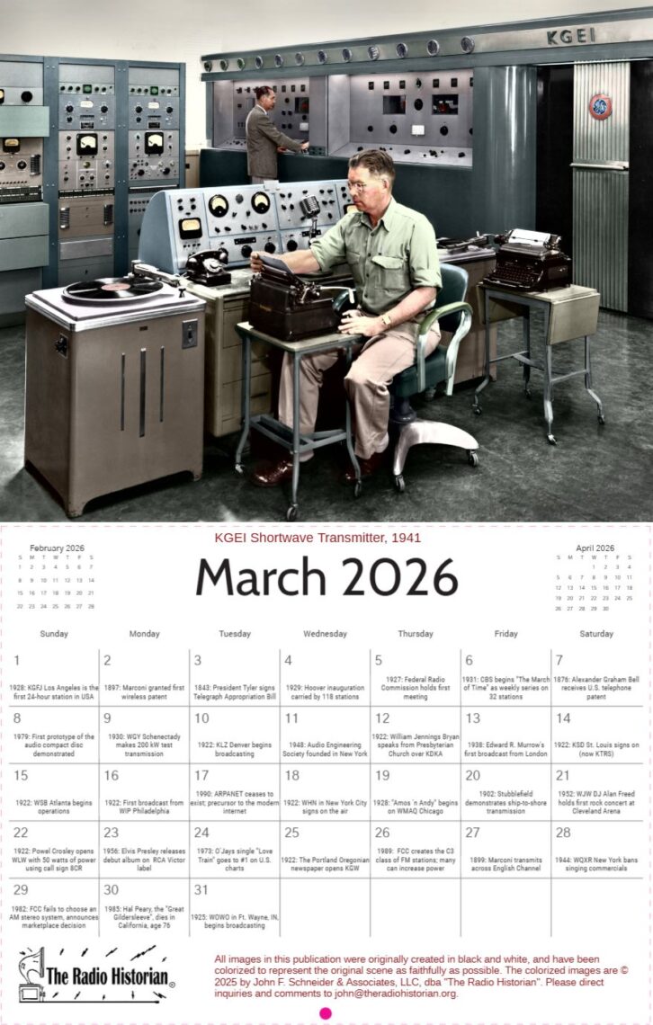 The 2026 edition of the “Radio Historian’s” calendar is now available. This year’s calendar features fourteen photographs that commemorate the Golden Age of Radio in the United States.