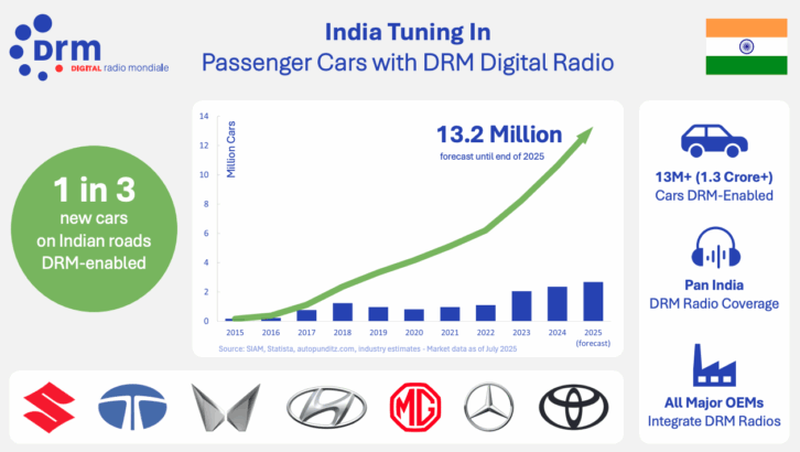 As India edges closer to allowing digital radio on the FM band, Digital Radio Mondiale is highlighting the growth in the number of vehicles in the country that can receive DRM signals.