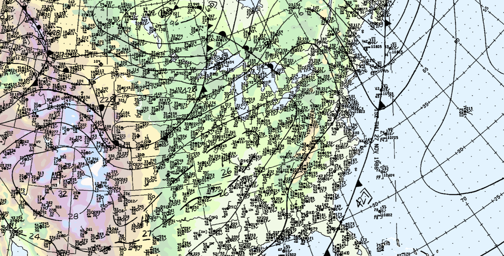 From the weather surface map below reflecting conditions on Nov. 27, 1986, you can see a sprawling high-pressure over Missouri, one of the ingredients for long-duration tropo.