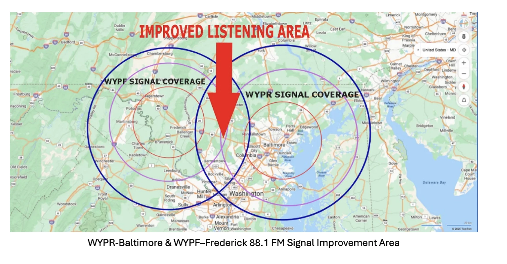 WYPR is also simulcast on 88.1 WYPF(FM) in Frederick and 106.9 WYPO(FM) in Ocean City.